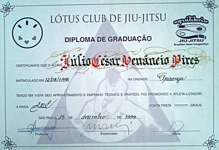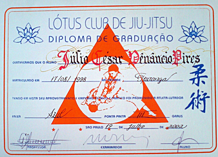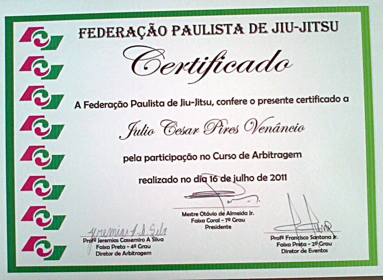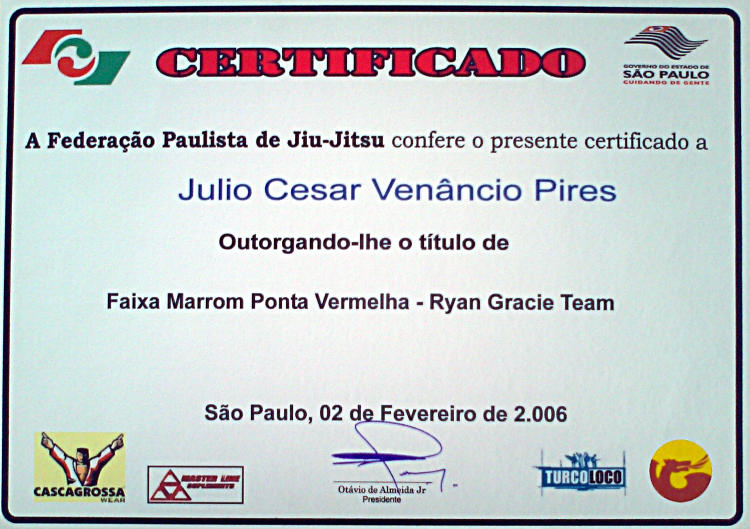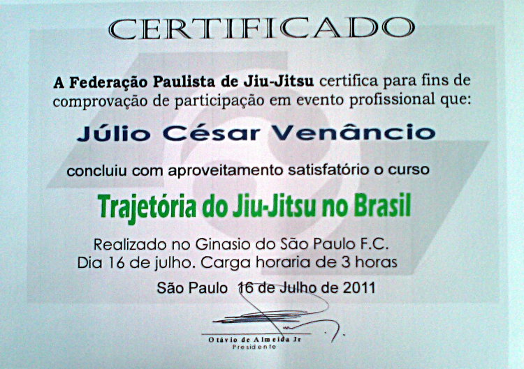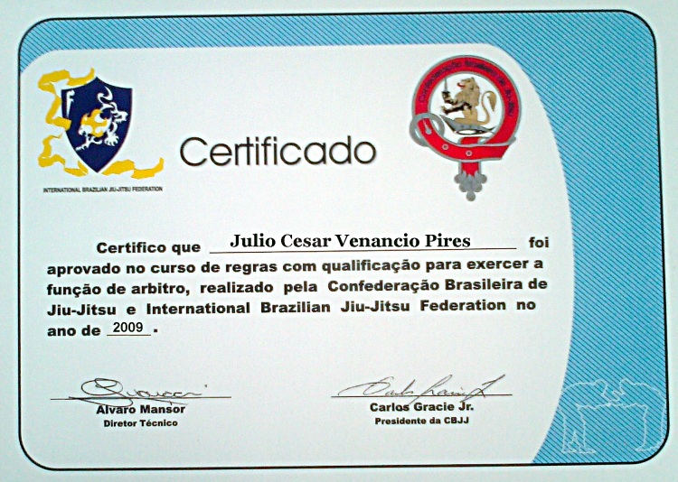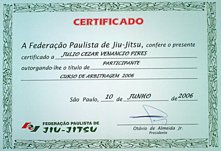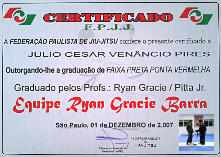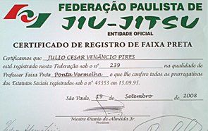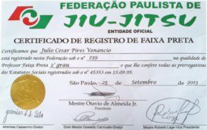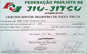 Homologado pela F.P.J.J. (Federação Paulista de Jiu-Jitsu) na qualidade de Professor Faixa Preta 3º Grau, o que lhe confere todas as prerrogativas dos estatutos sociais registrados.